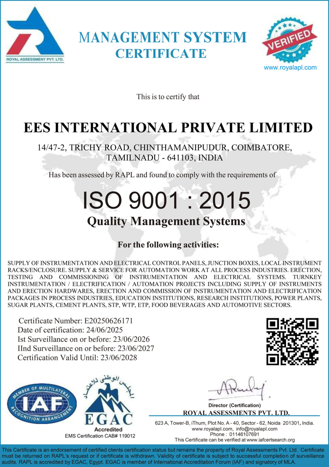 It is the policy of EES International Pvt Ltd to maintain a quality assurance system that will meet the requirements of ISO 9001-2015.